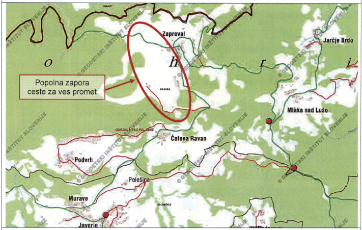 Vrsta zapore: popolna zapora jave poti na odseku od Fužine 2a do regionalne ceste Trebija – Sovodenj (v smeri proti Sovodnju)